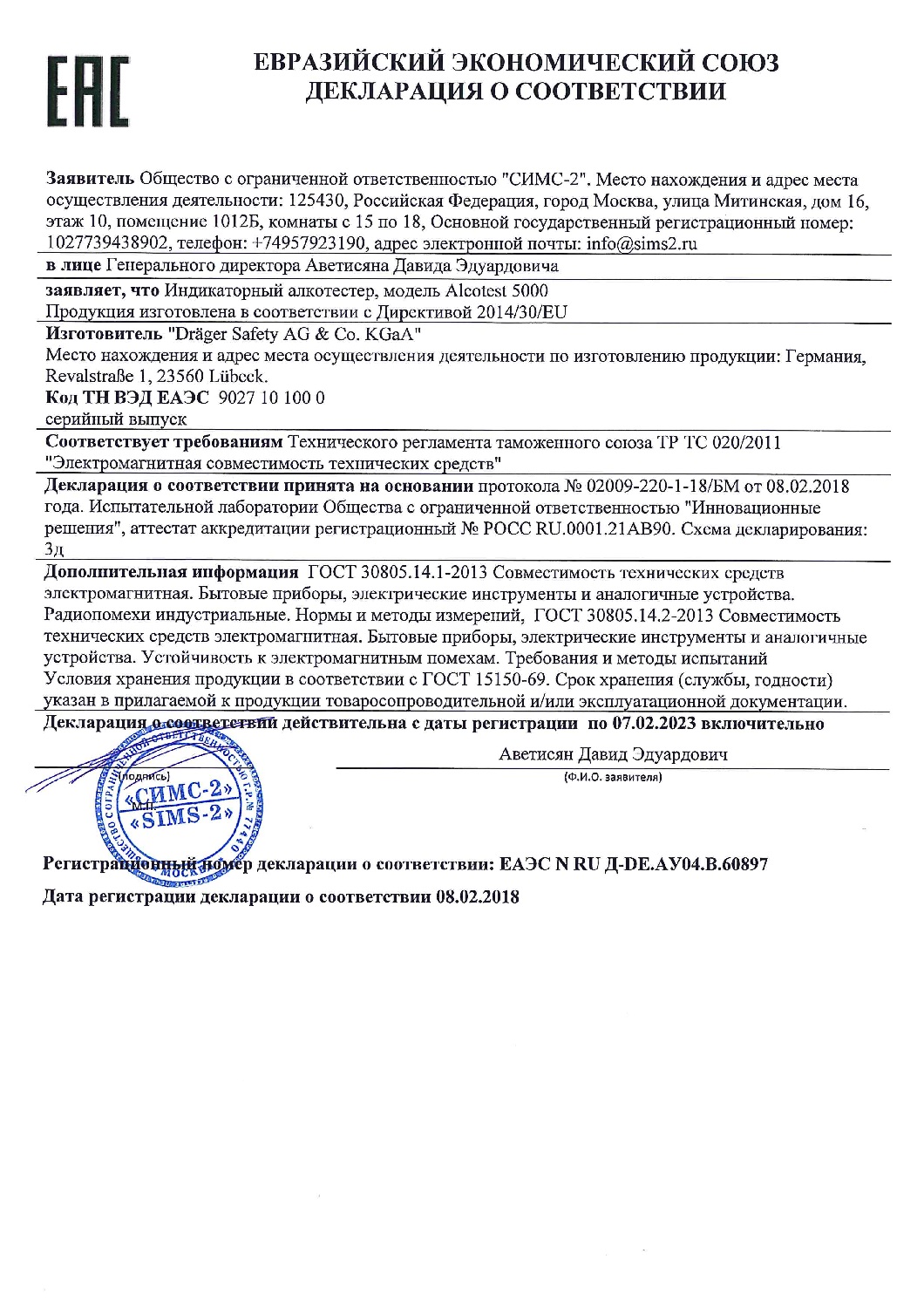 Произведенный в Германии, алкотестер "Drager Alcotest 5000" отвечает требованиям международной декларации соответствия. На ее основании осуществляются официальные поставки этого прибора в Россию. Для получения статуса медицинского измерительного прибора на территории нашей страны необходима регистрация алкотестера в Министерстве здравоохранения. Именно эту процедуру в настоящее время проходит устройство.