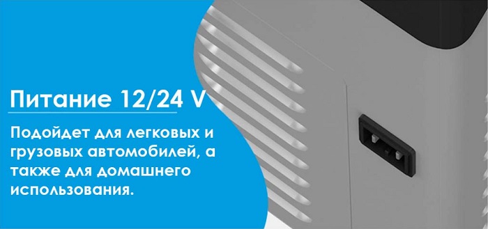 питается от автоприкуривателя 12/24 В или от обычной розетки 220 В через адаптер;