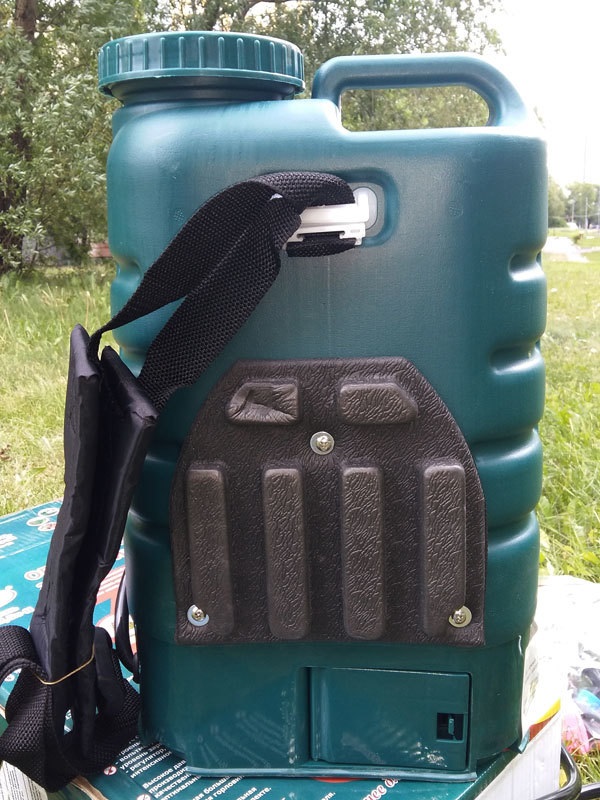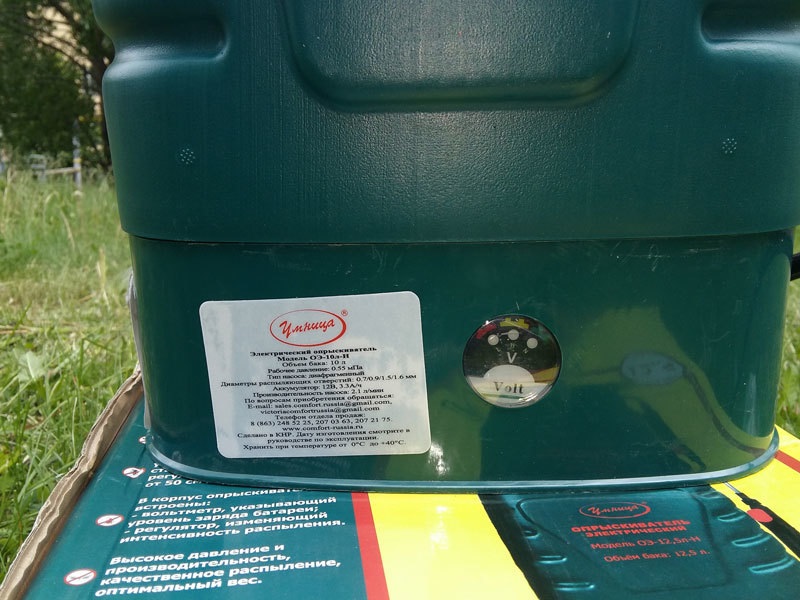У данной модели опрыскивателя установлен съемный свинцово-кислотный аккумулятор, емкость которого составляет 3,3 А/ч. Отсек для аккумулятора располагается на задней стороне корпуса устройства и закрывается на защелкивающийся замок. Отсек легко открывается, что позволяет быстро извлечь аккумулятор, чтобы убрать его на зимнее хранение или заменить на новый после выработки его ресурса.