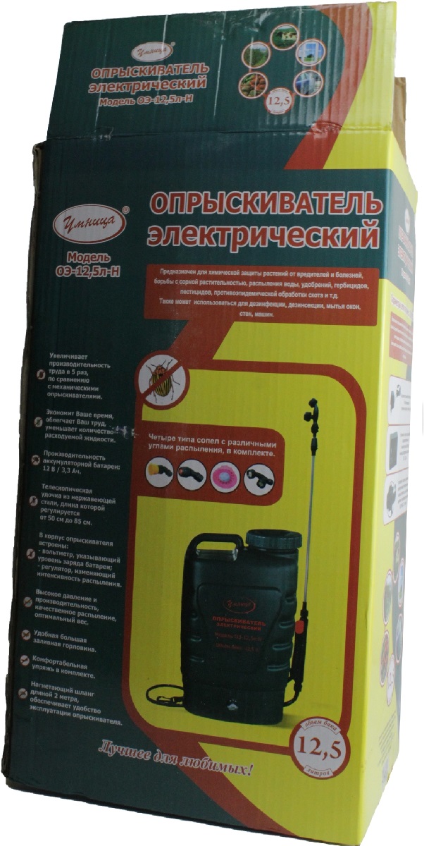 Практически все садоводы используют опрыскиватели для обработки деревьев и растений на грядках. Кто-то приобретает механические устройства, кто-то пользуется кустарными приспособлениями. Такая работа отнимает массу сил и времени. Наш магазин представляет автоматический универсальный опрыскиватель "Умница ОЭ-12,5л-Н", который можно использовать как в саду или на огороде, так и в быту для мытья машины, окон, стен дома и т.д. Это устройство обладает эффективностью в 5 раз выше механических аналогов. Вы без проблем сможете опрыскать все деревья в вашем саду и урожай на грядках за короткое время, приложив минимум ручного труда. Вместительное устройство можно использовать даже на небольших семейных фермах.