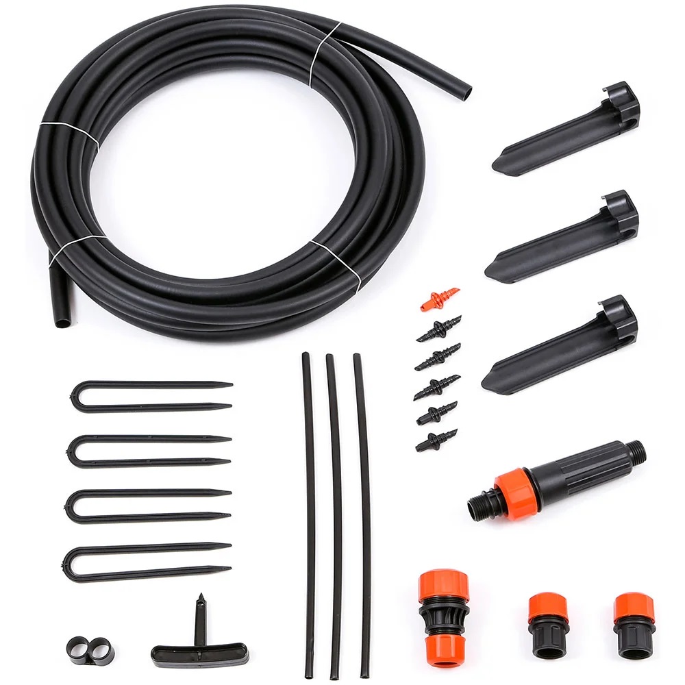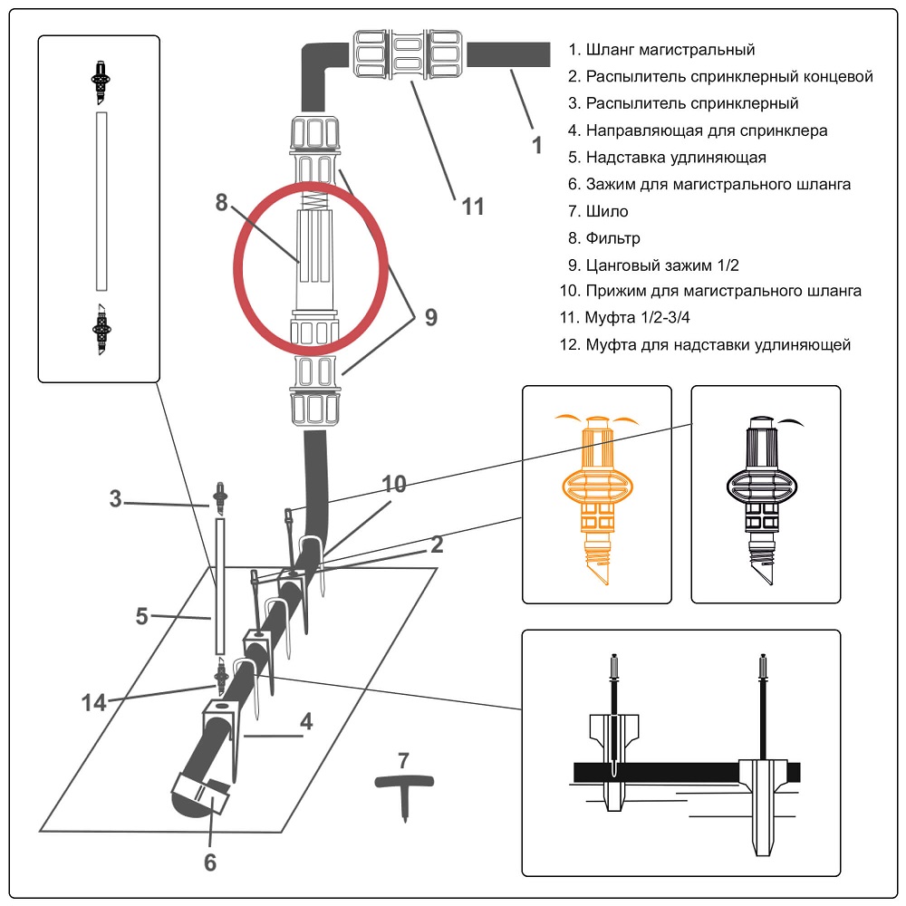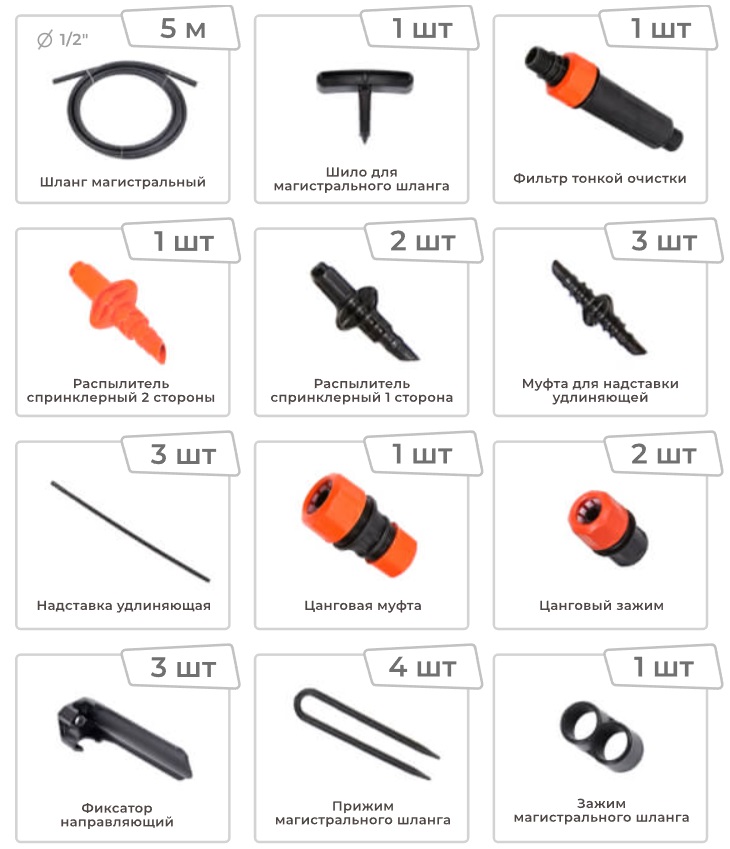 Полный комплект необходимых аксессуаров — набор поставляется в картонной коробке с ручкой для переноски. В состав набора входит все необходимое для монтажа и эксплуатации системы — вам не придется ничего докупать! Для врезки фильтра очистки воды предназначены цанговые зажимы 1/2", а удлиняющие надставки для распылителей монтируются в магистральный шланг с помощью муфт. Также вы найдете в наборе шило для прокалывания отверстий в магистральном шланге.