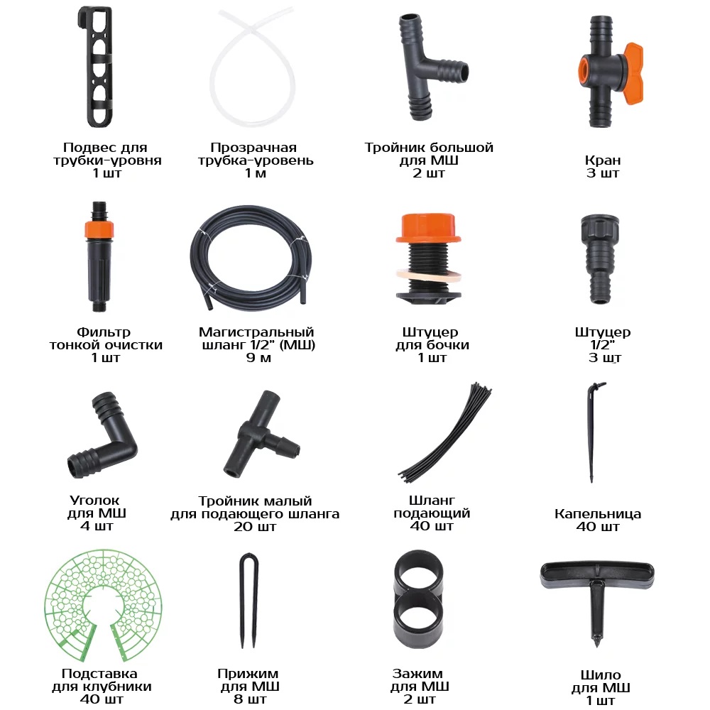Простое подключение к емкости с водой — на многих дачных участках отсутствует центральное водоснабжение, но это не проблема. Данная система полива подключается к емкости с водой, что очень удобно. Рабочее давление системы — всего 0,1-0,2 атмосферы, "врезка" системы в емкость осуществляется с помощью комплектного штуцера с уплотнительным герметичным кольцом. Регулировать подачу воды можно с помощью крана, который также входит в комплектацию набора.