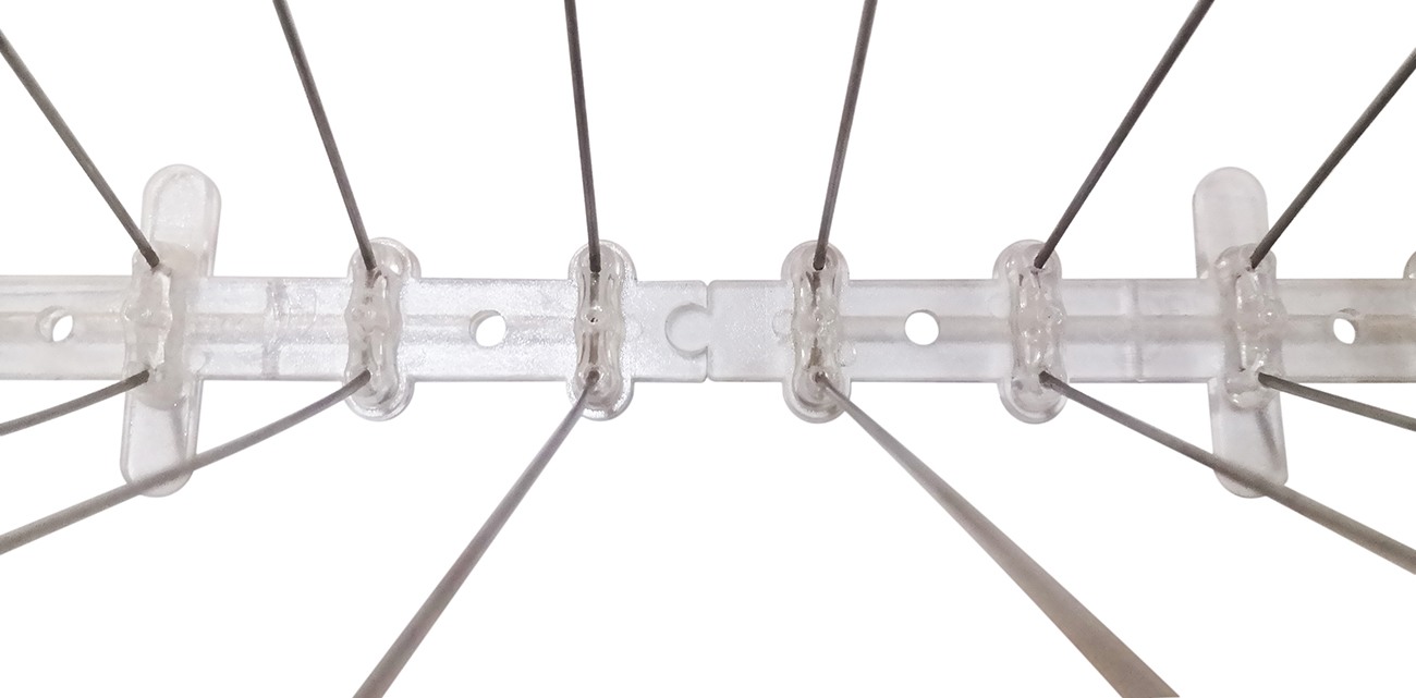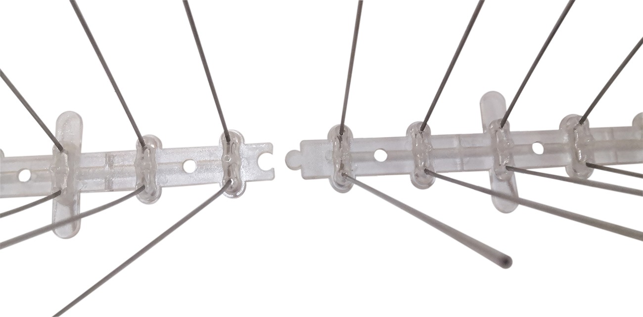 Долговечное гибкое основание секций. Шипы крепятся к основанию, изготовленному из гибкого прочного полимера. При необходимости его можно изогнуть под большим углом. Таким образом, данные шипы можно монтировать не только на ровные горизонтальные поверхности, но и на наклонные, а также изогнутые (карнизы, ЛЭП, объекты архитектуры, памятники и т.д.).