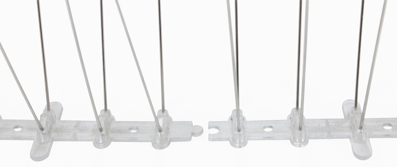 Вы можете замостить шипами от птиц поверхность любой длины. На каждой секции шипов имеется стыковочный фиксатор-замок. Соединяйте последовательно секции между собой и фиксируйте их на элементы крепежа. Если длина секции с шипами оказалась больше длины поверхности, просто отломите гибкое основание секции в нужном месте.