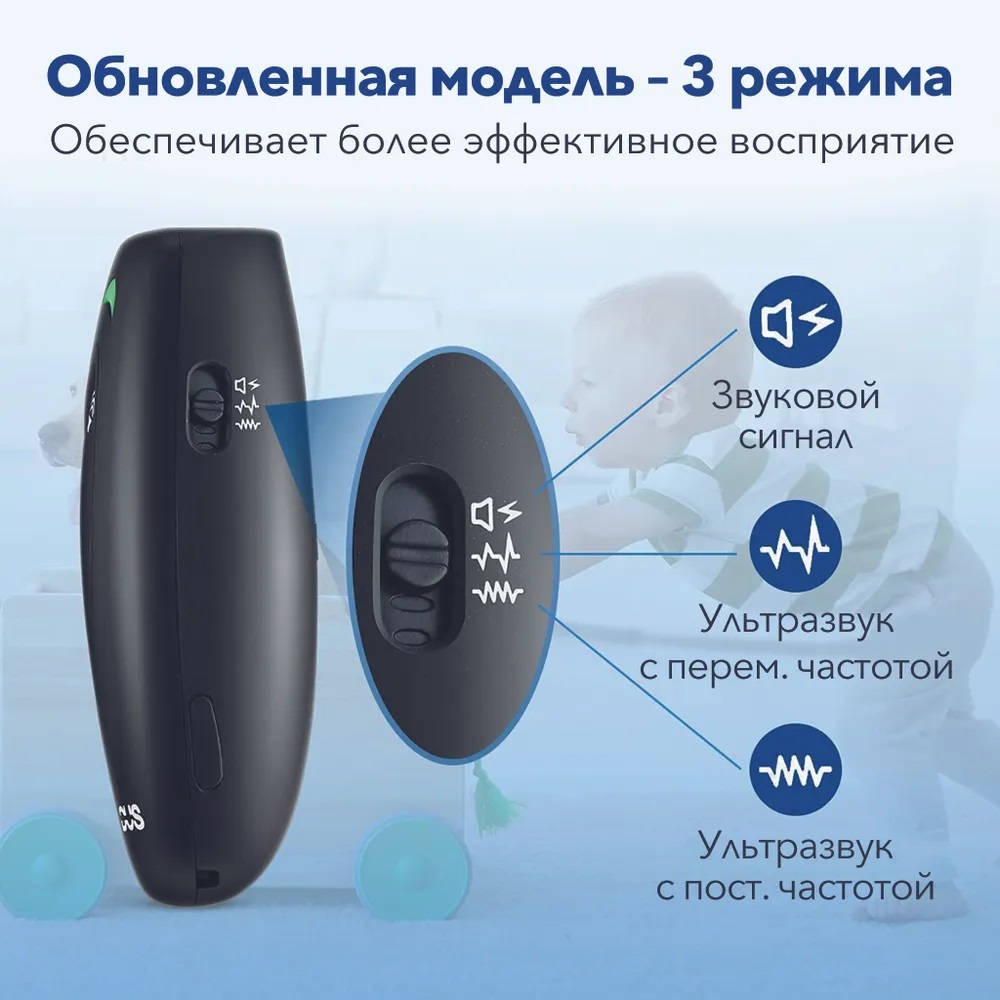 Три режима работы — в отличие от многих аналогов, работающих только в одном режиме, отпугиватель "MODUS М-231" может работать в одном из трех доступных режимов. Это звуковой сигнал (очень эффективен для дрессировки собак), излучение ультразвука на постоянной частоте или ультразвук с изменяющейся частотой, который еще сильнее воздействует на нервную систему собак. Для переключения между режимами у прибора имеется боковой механический переключатель.