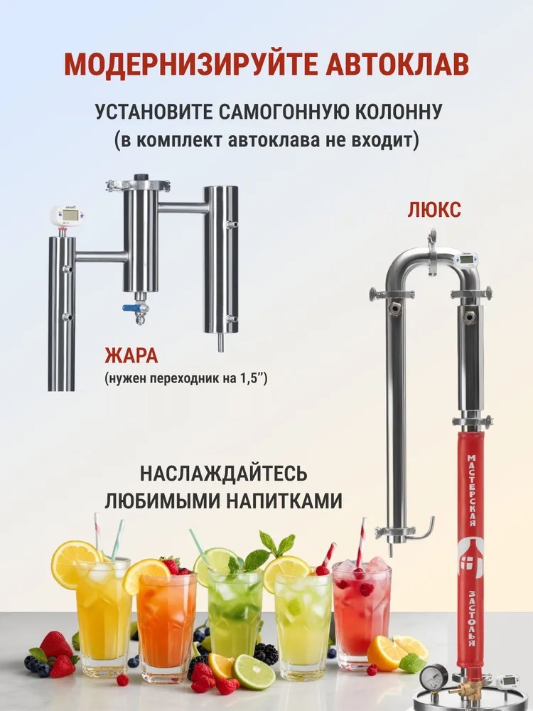 Автоклав "Мастерская застолья 2.0" имеет в крышке дополнительное кламповое соединение, закрытое заглушкой. При желании вы можете докупить фирменную насадку-дистиллятор или даже полноразмерную бражную колонну, установить ее вместо заглушки и превратить автоклав в полноценный самогонный аппарат! Таким образом, с помощью одного устройства вы сможете делать в домашних условиях не только вкуснейшие консервы, но и аналоги самых разных алкогольных напитков: от водки до джина и кальвадоса.