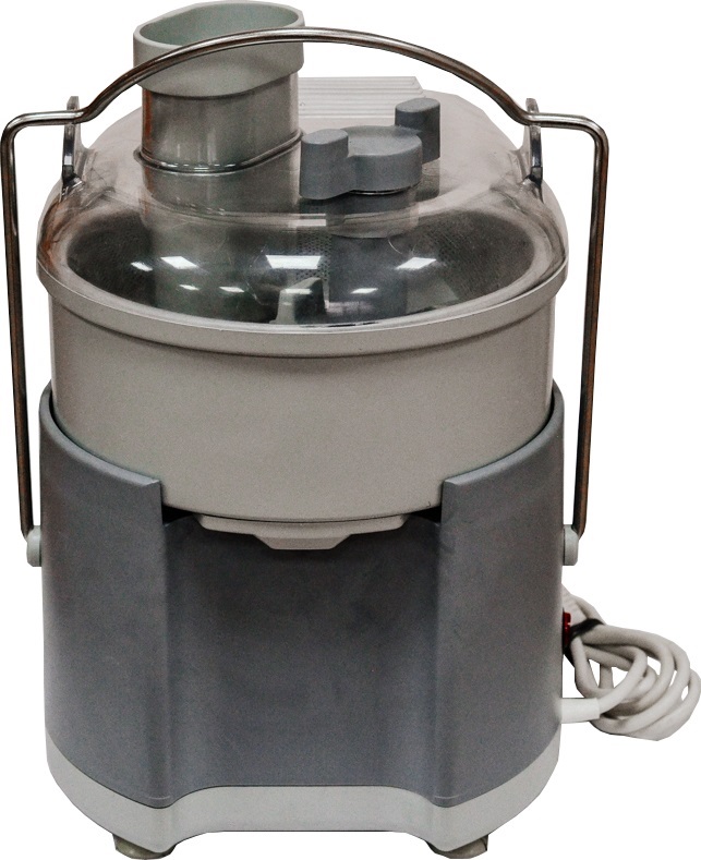 Это бытовой кухонный прибор включается в обычную розетку 220 В. Высокая производительность устройства позволяет использовать его не только в быту, но и на малом производстве (небольшая ферма или малое предприятие) для получения десятков литров сока за час. В эксплуатации прибор очень прост и удобен. На его корпусе имеется всего одна клавиша для включения и выключения мотора. Изделие состоит из неразборного моторного блока, оснащенного ножками-присосками, которые прочно фиксируют его на рабочей поверхности. Кроме того, имеется разборная часть конструкции, ее необходимо собрать, следуя схеме из инструкции. Это делается элементарно просто. Под выход для сока установите комплектный стакан, а под выход для жмыха — какую-нибудь вместительную емкость. Включите прибор в розетку.