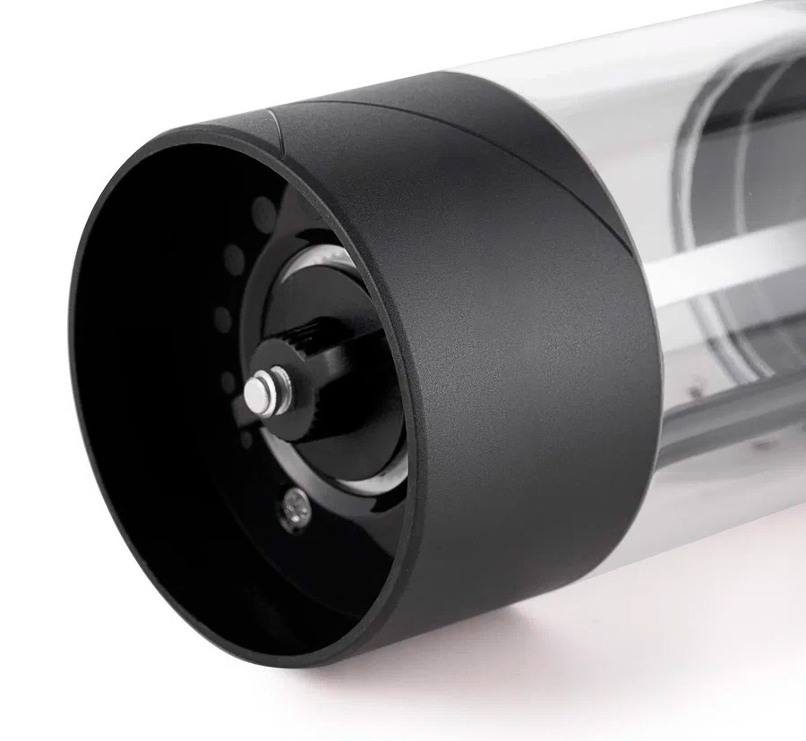 Устройства с электромоторами — обе мельницы оборудованы электрическими моторами. Для измельчения специй не нужно прикладывать физические усилия. Достаточно нажать кнопку на корпусе, чтобы механизм измельчил приправу и добавил ее в блюдо. Мощность мотора мельницы — 15 Вт, этого достаточно, чтобы качественно измельчить любую сухую приправу, включая горошины перца или кристаллы соли. Кнопка активации расположена очень удобно — прямо под большим пальцем.