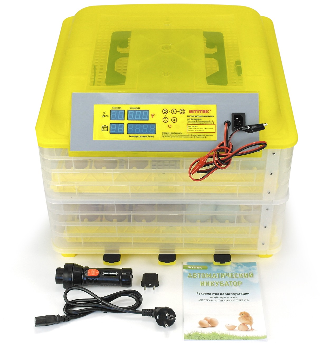 Сверхъемкий цифровой инкубатор с терморегулятором и автоматическим переворотом "SITITEK 96" вмещает до 96 куриных яиц . Отличается полностью автоматической работой , поддерживая заданную температуру, для чего оборудован высокоточными термостатом , а также вентилятором. При невозможности удерживать надлежащие параметры система подает тревожный сигнал. Аппарат снабжен четырьмя цифровыми LED-табло, на которых отображаются не только показатели микроклимата, но и таймер, отсчитывающий время инкубации. Прозрачный двухсекционный корпус позволяет следить за яйцами без открытия крышки, что немаловажно на последней стадии инкубации. Аппарат работает от сети 220 В или резервного источника на 12 В . В комплекте имеется овоскоп для проверки яиц на просвет.
