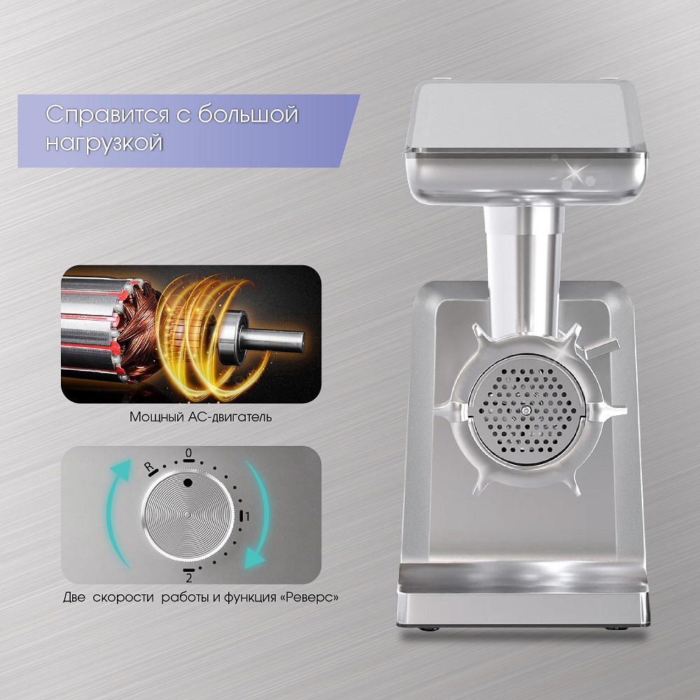 производительность достигает 2,7 кг фарша в минуту благодаря мотору 2700 Вт;
