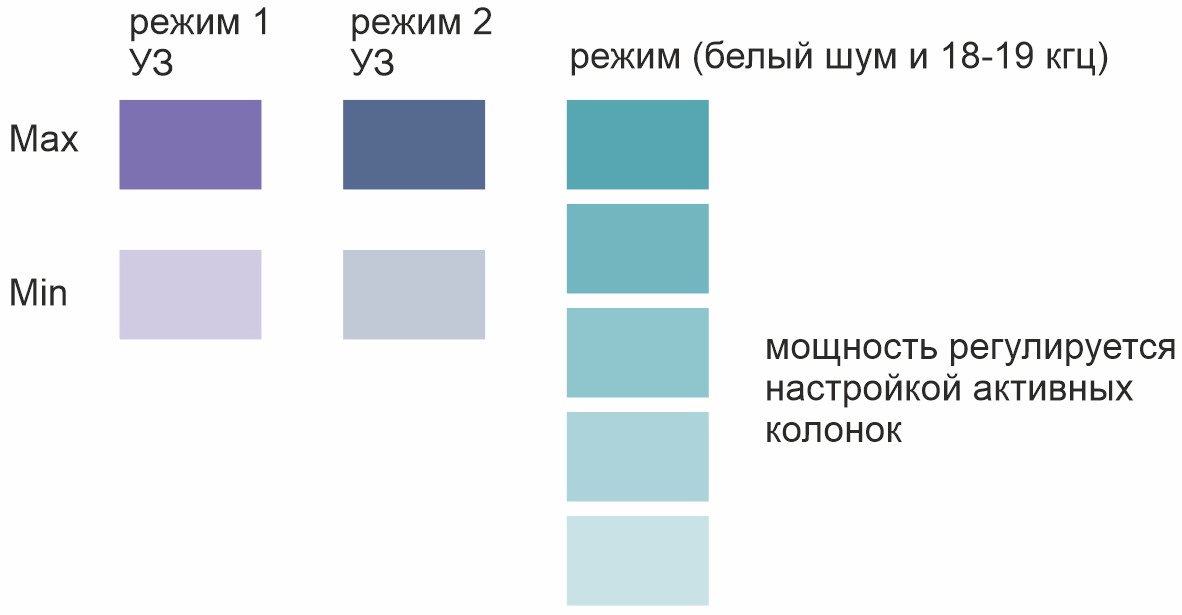 Генерация УЗ помехи в двух режимах, регулировка мощности. Помеха может излучаться в двух режимах, при этом каждый режим имеет свои особенности при воздействии на прослушивающие устройства. Пользователь может регулировать уровень мощности УЗ излучения и речеподобной помехи. Это позволит либо добиться максимального эффекта, либо обеспечить практически бесшумную работу подавителя микрофонов.
