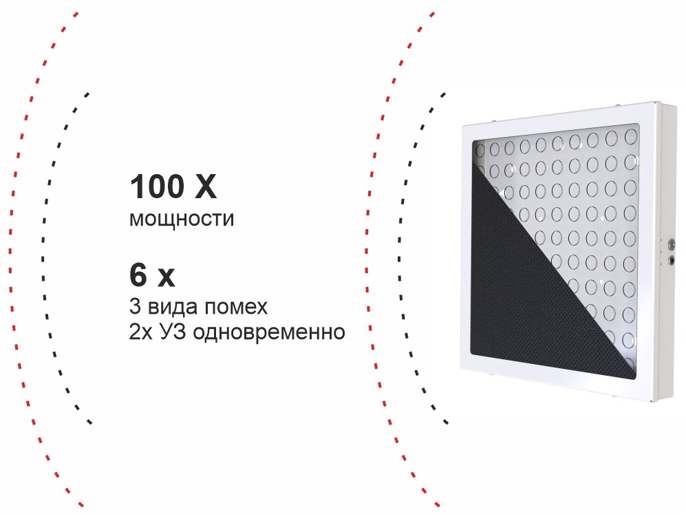 Внутри установлены 100 УЗ излучателей. Такое большое количество излучателей позволяет создать очень мощную помеху для работы звукозаписывающих устройств. В помещении формируется "плотный" УЗ сигнал, блокирующий работу шпионских устройств на расстоянии до 10 м. Угол, под которым распространяется помеха, составляет 180°, оптимальное расстояние для работы подавителя — 4 м.