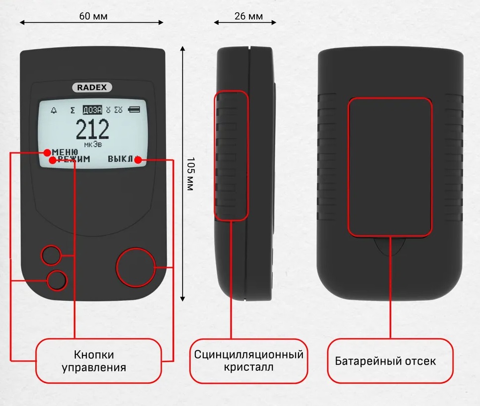 Информативный дисплей — на лицевой панели корпуса прибора расположены кнопки управления, а также ЖК дисплей. Все пункты меню написаны на русском языке, что значительно упрощает эксплуатацию устройства. В центре экрана отображается цифровое значение результата измерения, под ним указывается единица измерения и уровень погрешности. Кроме того, на дисплей выводятся индикаторы: режим работы, вид активной сигнализации, шкала мощности дозы, текущие функции кнопок.